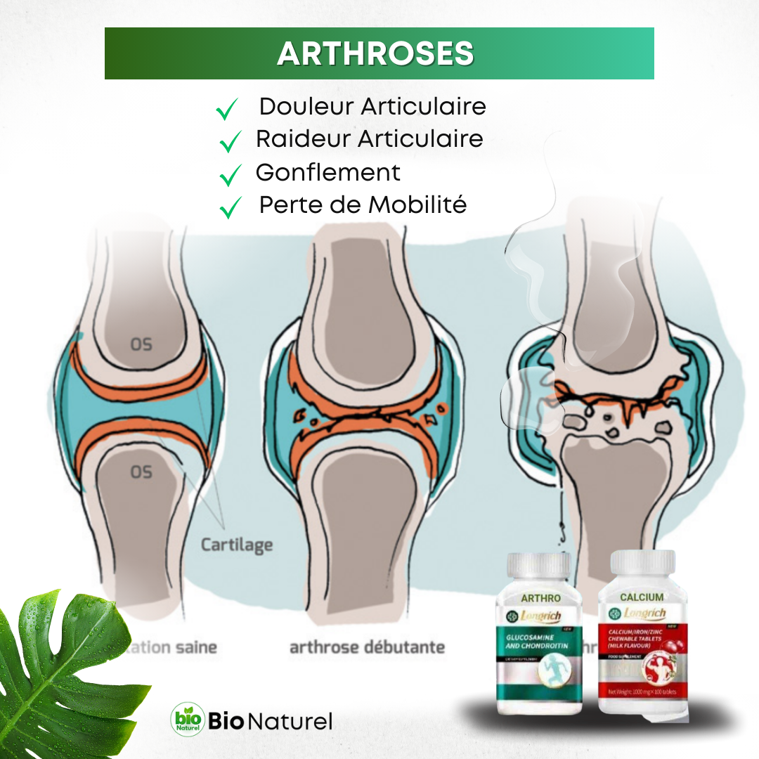 L'arthrose peut rendre les mouvements difficiles et douloureux. Avec notre pack Arthro et Calcium, vous bénéficiez d'une aide précieuse dans la gestion de l'arthrose. Il favorise la régénération du cartilage et réduit l'inflammation, vous permettant de retrouver confort et souplesse articulaire.